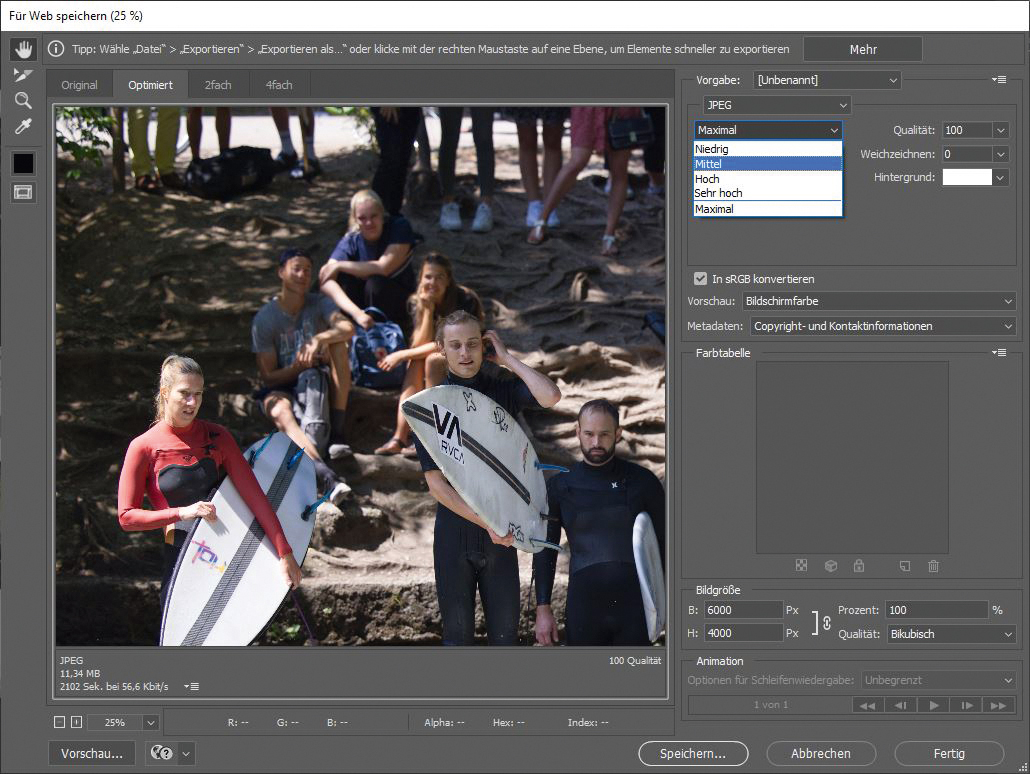 Anstatt die Auflösung zu reduzieren, kannst du auch eine höhere Komprimierung auf deine Bilder anwenden. Eine Ausgabe-Qualität von sieben oder acht in Photoshop (Mittel/Hoch) erzeugt eine brauchbare Webqualität mit minimalen Artefakten, benötigt jedoch höhere Auflösungen für die Anzeige in einer großen Galerie. Die stärkere Komprimierung erschwert das Erstellen großer Ausdrucke aus gestohlenen Dateien.
