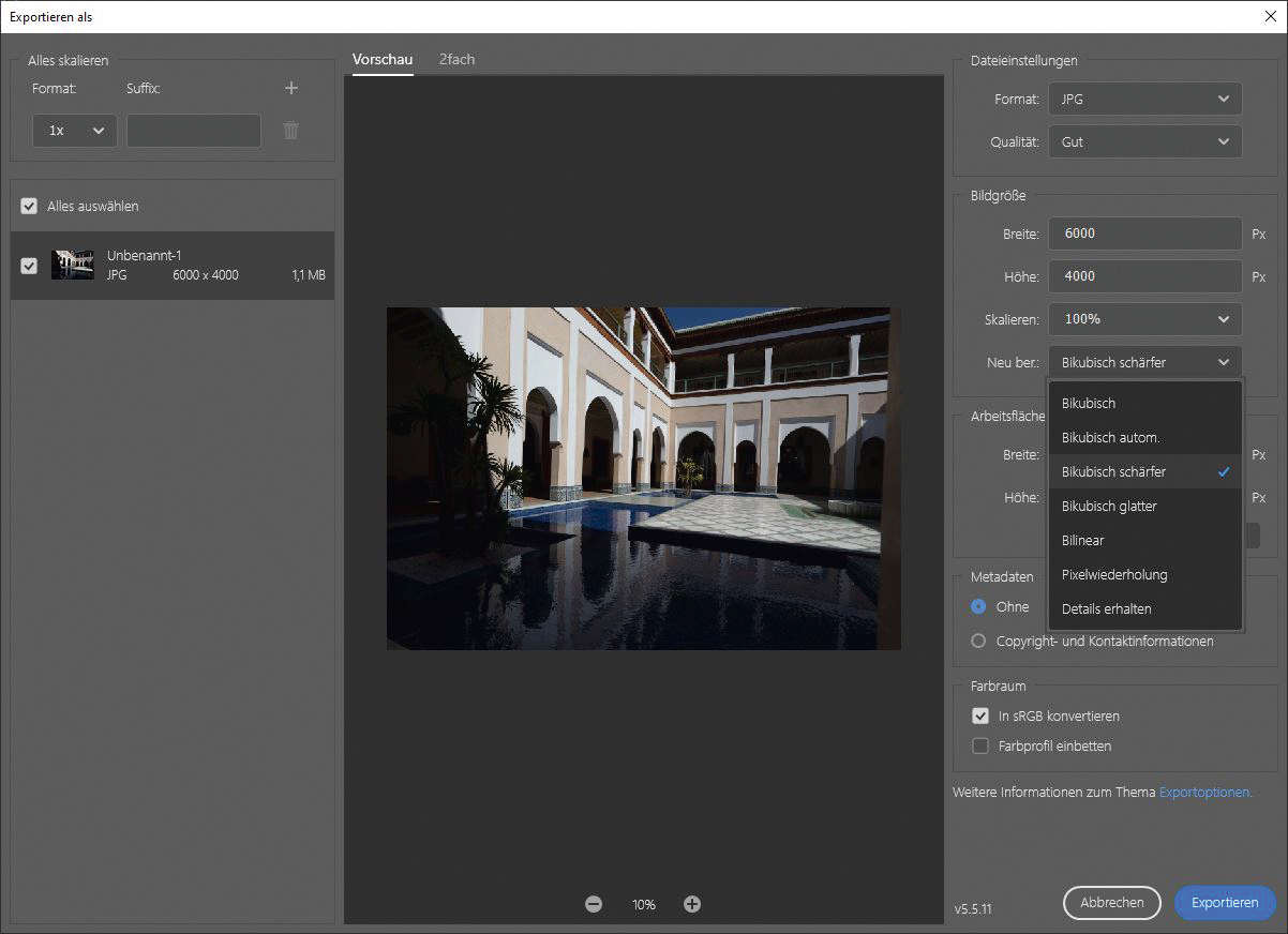 Die wahrscheinlich gebräuchlichste Lösung ist die Verwendung von Software, um eine Kopie mit niedriger Auflösung der Bilder zu erstellen, die du auf deine Website hochladen möchtest. Dies verhindert zwar keinen Diebstahl, schränkt die Handlungsmöglichkeiten von Personen mit böswilligen Absichten aber stark ein. Der große Nachteil besteht darin, dass Dateien mit sehr niedriger Auflösung möglicherweise keine Vollbildvorschau zulassen, was das Engagement der Betrachter:innen beeinträchtigt.