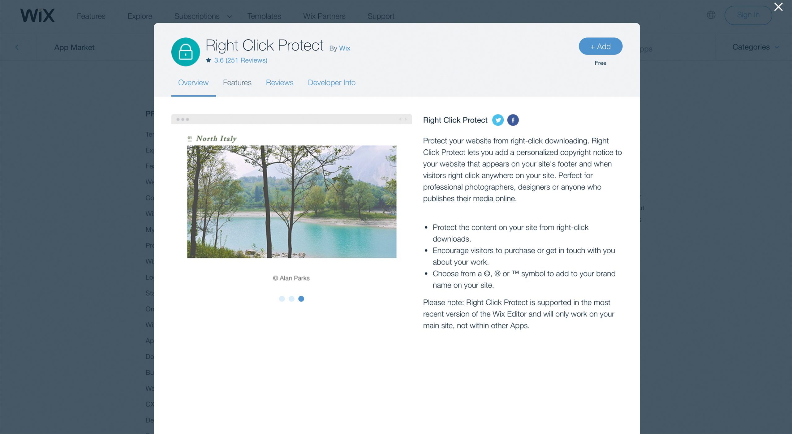 Dieser Schutz besteht normalerweise aus einem Programm, das Benutzer:innen, die versuchen, Bilder mit der Rechtsklickfunktion zu kopieren, eine Urheberrechtsmeldung anzeigt. Während einige Website-Betreiber dafür Gebühren erheben, bieten andere Websites wie Wix kostenlose Schutzfunktionen an. Dedizierte Schutzpakete wie Smartframe verfügen über erweiterte Funktionen zum sicheren Einbetten von Fotos auf Ihrer Website.