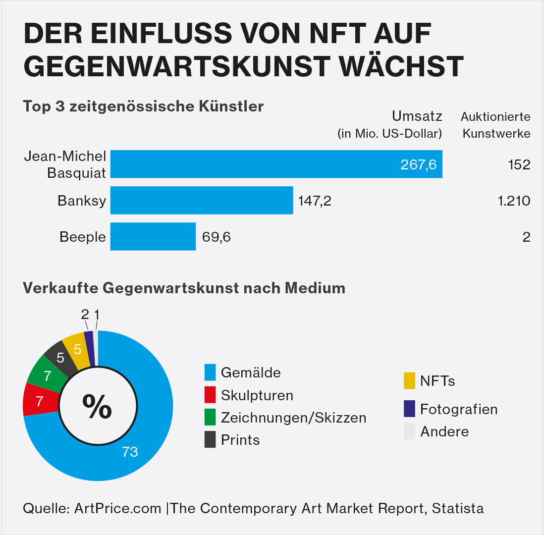 Spätestens seitdem das Auktionshaus Christie’s im März 2021 das JPEG einer Digitalcollage aus 5.000 Fotos für legendäre 69,3 Millionen US-Dollar als NFT versteigerte, sind die Begriffe NFT und Krypto-Kunst weit über das digitale Universum und die Kunstwelt hinausgewachsen. Mit dem Millionen-Erlös für seine digitale Arbeit „Everydays: The First 5.000 Days“ ordnete sich der Grafikdesigner Mike „Beeple“ Winkelmann nicht nur in die Rekordsummen physischer Kunstwerke ein, sondern etablierte NFT auch als Medium und Nische in der Gegenwartskunst (siehe nachfolgende Grafik).