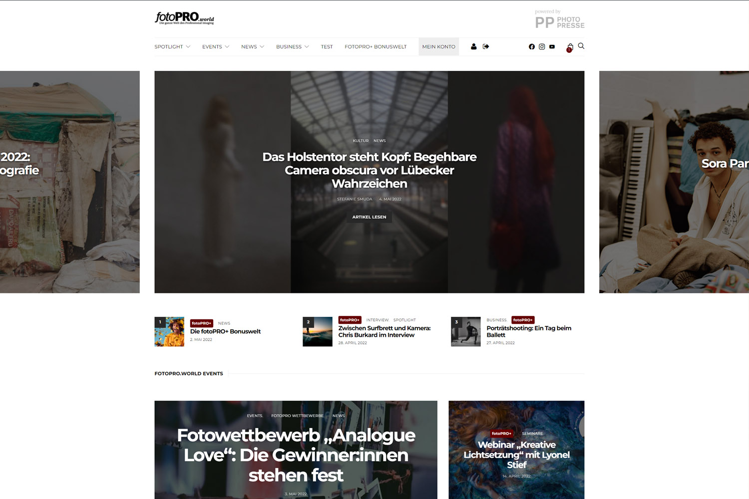 Jetzt Mitglied bei fotoPRO+ werden und von vielen Vorteilen unseres Portals profitieren. Bei uns findet ihr täglich Berichte und Insights aus der Welt der professionellen Fotografie, von Fotokultur bis zu neuen Produkten und das ganze gewürzt mit Meinungsbeiträgen und Businesstipps. Wir sind die Anlaufstelle für alle engagierten Fotografinnen und Fotografen.