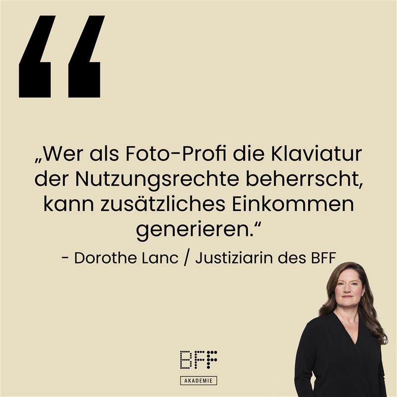 „Wer als Foto-Profi die Klaviatur der Nutzungsrechte beherrscht, kann zusätzliches Einkommen generieren“, sagt Dorothe Lanc. Nach dem erfolgreichen After-Work-Vortrag der BFF Akademie zum Thema Panoramafreiheit vermittelt die Spezialistin für Rechtsfragen in der Session am Dienstag, den 13. Dezember 2022 um 19 Uhr kompakt wichtiges Basiswissen zu urheberrechtlichen Nutzungsrechten.