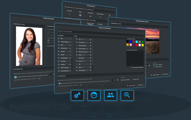 Nach der Analyse stehen verschiedene KI-basierte Suchfunktionen wie die Suche nach ähnlichen Fotos, Stichwortsuche, Suche nach dominanten Farben, Suche mit externen Fotos sowie differenzierte Möglichkeiten zur Personen- oder Gesichtersuche zur Verfügung. So wird es zum Kinderspiel, das schöne Pilzfoto mit Bokeh oder die besten Brückenfotos in der blauen Stunde für den nächsten Fotowettbewerb aus dem Fotoarchiv zu fischen. Es gelingt ebenso leicht, Alben mit Fotos der Kinder im Laufe der Jahre anzulegen. Oder auch alle Fotos von Tante Herta auf der Hochzeit ihrer Nichte herauszusuchen, die sie zusammen mit der Braut zeigt und bei denen beide lächeln und die Augen geöffnet haben.