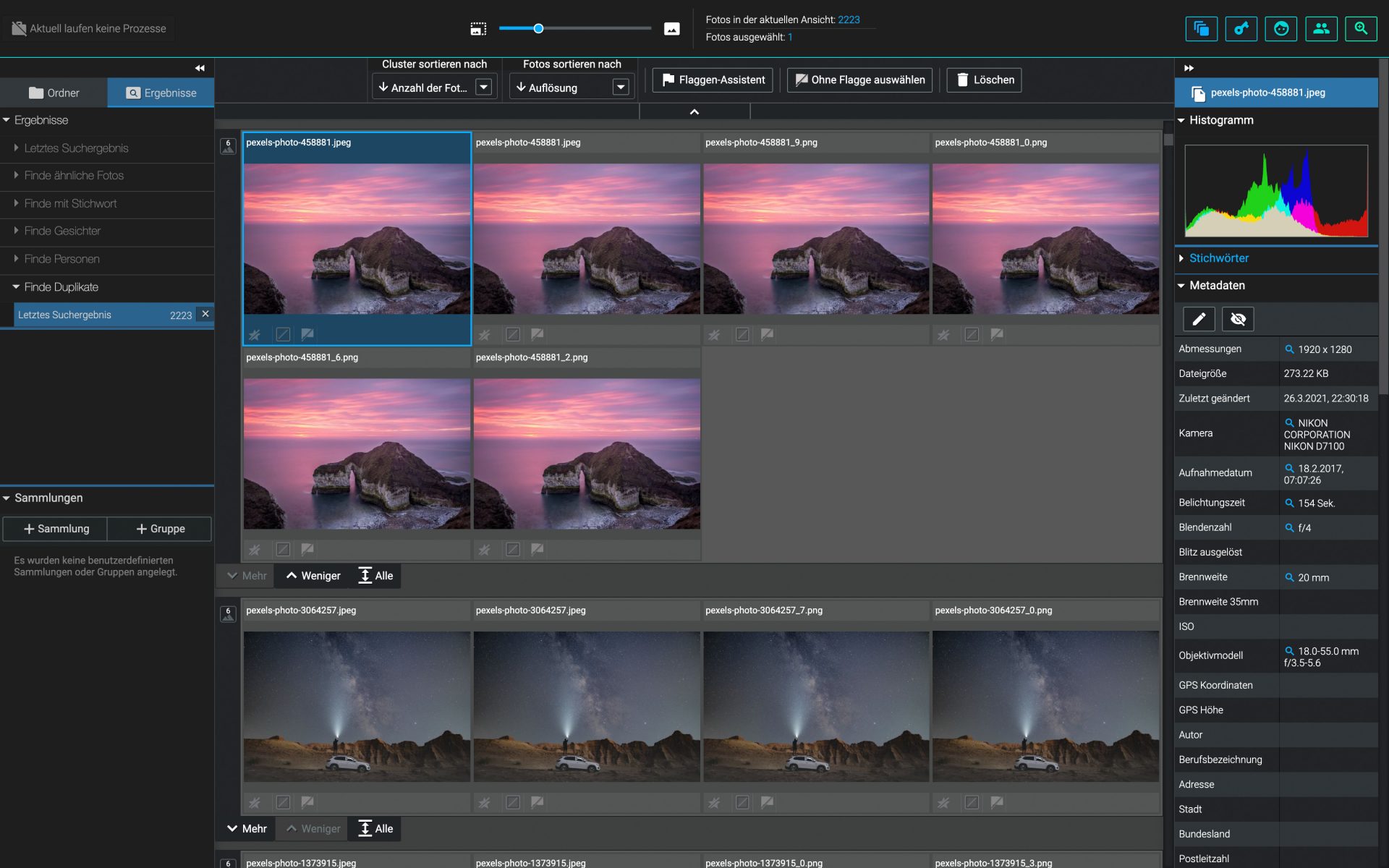 Abhilfe schafft die in Deutschland entwickelte Bildverwaltung Excire Foto, die jetzt in der erweiterten und optimierten Version Excire Foto 2022 vorliegt. Die Software verfügt über einen Duplikatefinder, der echte Dateiduplikate, unterschiedliche Versionen identischer Ausgangsbilder oder auch sehr ähnliche Bilder und Fotos aus Serienaufnahmen in Sekundenschnelle auffindet, sortiert, organisiert oder bereinigt. Und zwar über das gesamte Bildarchiv mit seinen zahlreichen Festplatten und Ordnern hinweg.
