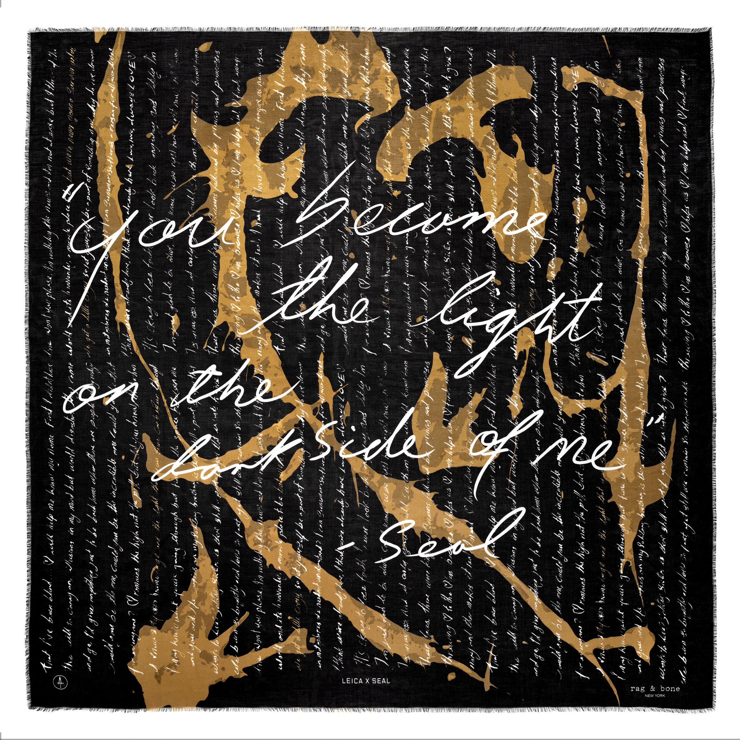 Ihre kunstvolle Umsetzung von „You became the light on the dark side of me“ aus dem Song „Kiss from a Rose“ und weiteren handgeschriebenen Liedzeilen aus Seals unerschöpflichem Repertoire machen dieses Kleidungsstück zum Inbegriff eines Lebensgefühls, das geprägt ist von Musik, Emotion und Leidenschaft. Der Schal wurde von dem New Yorker Modelabel rag & bone umgesetzt und in Italien produziert. Einen weißen Schal im gleichen Design gibt es exklusiv in vielen Leica Stores.