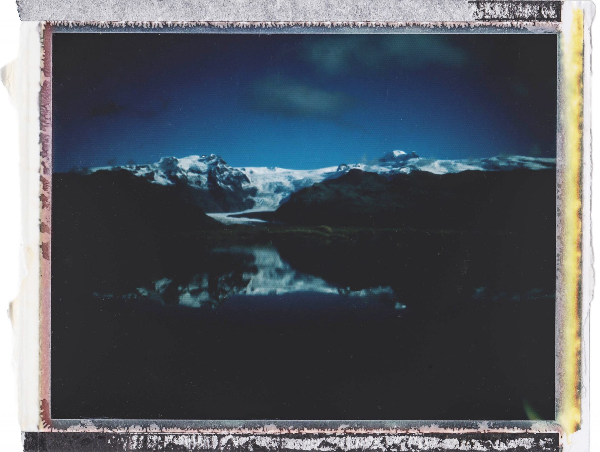 „Das Bild ist ein Fuji FP100 Trennbild-Polaroid, aufgenommen mit einer alten Landkamera. Der abgebildete Gletscher ist der Skaftafell auf Island. Ich habe bewusst das Positiv des Trennbildes von hinten abgezogen, um noch einen Teil der Entwicklungsemulsion und des Negatives auf dem Bild sichtbar zu belassen. So habe ich dem Bild die Rauheit und unperfekte Schönheit Islands mitgegeben, die meine Seele so sehr berührt hat.“