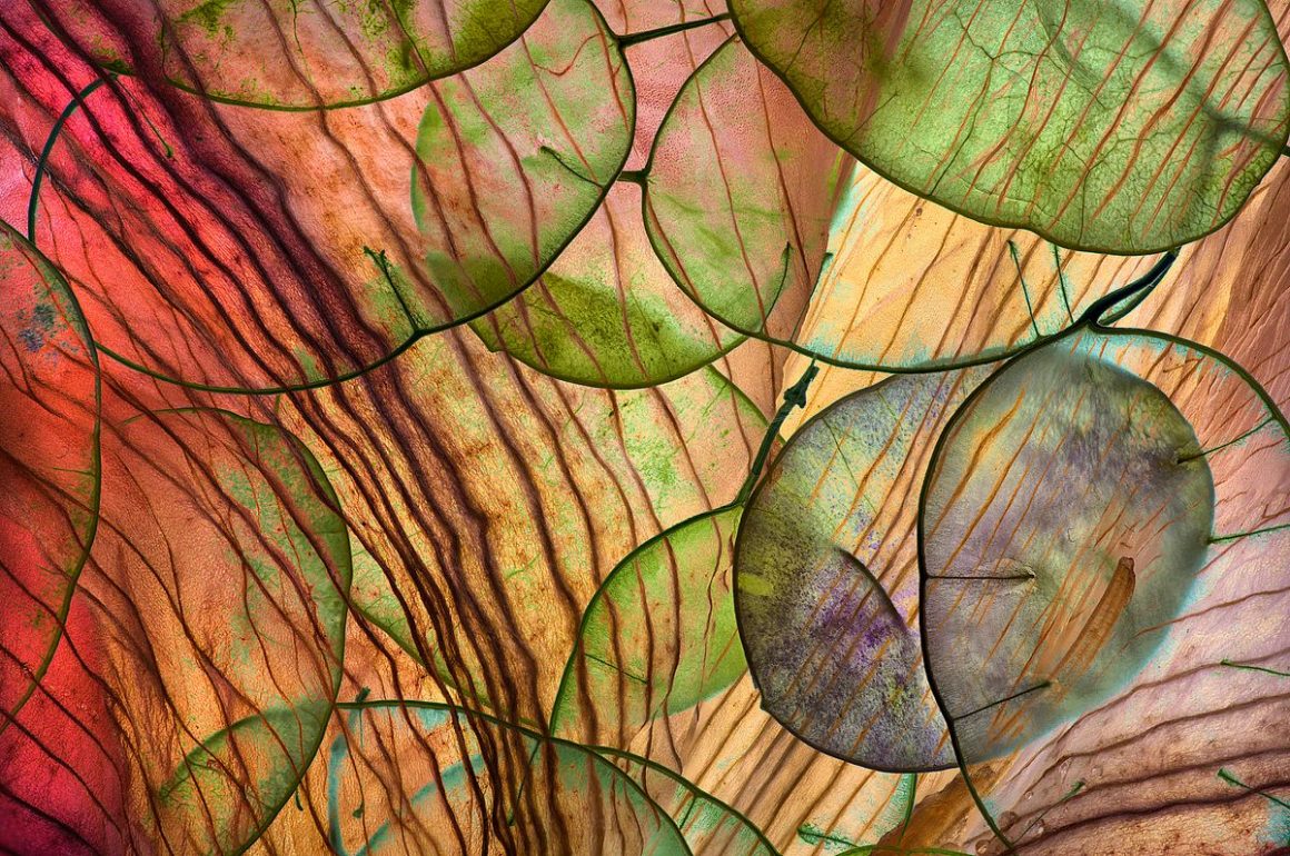 Der Fotograf verwendete ein Makroobjektiv mit zweifacher Vergrößerung, um diese Mischung aus Amaryllis-Blütenblättern aufzunehmen, die ich mit Silberblatt-Samenschoten überlagert habe.