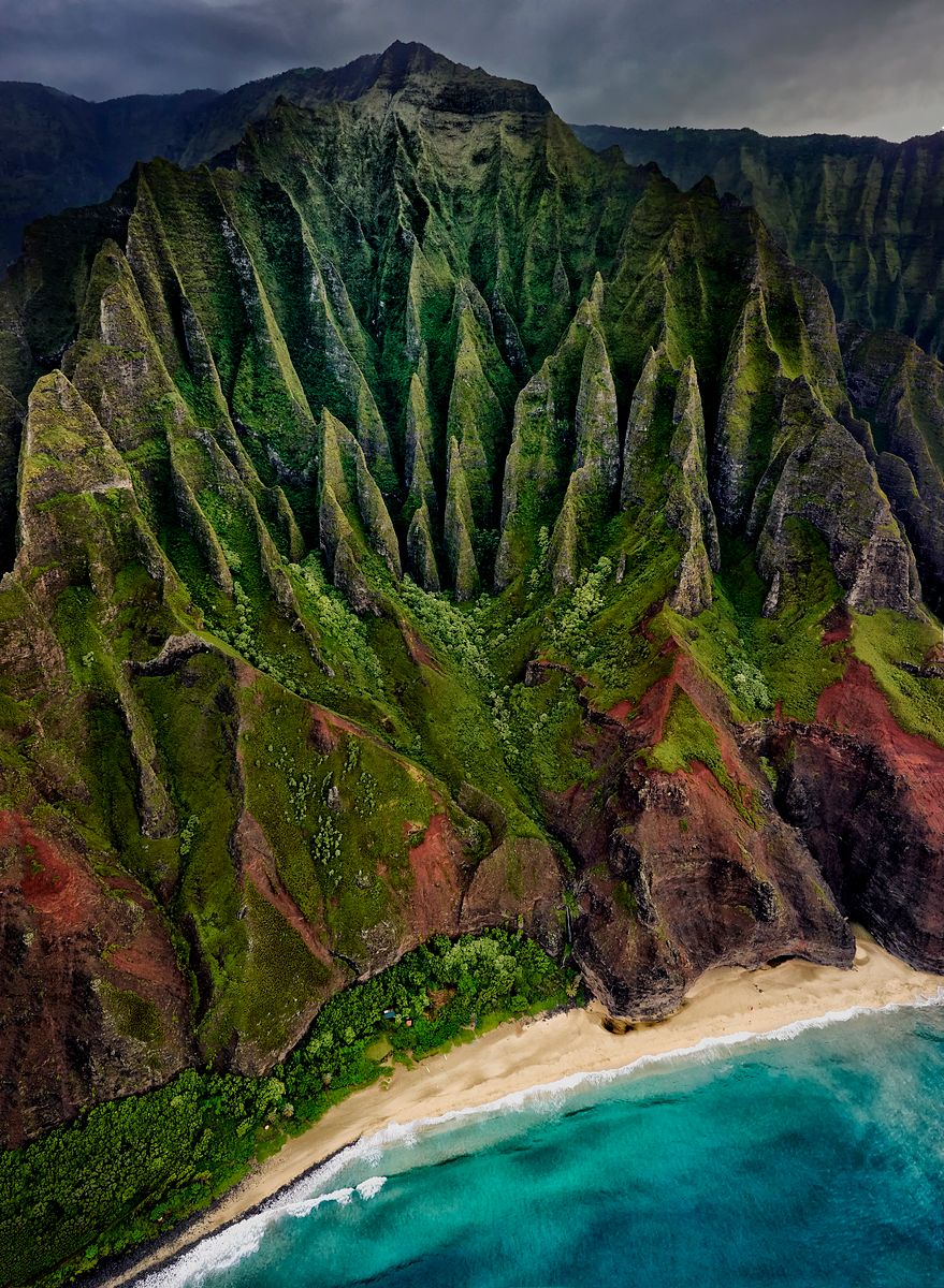 Die Luftaufnahme von Stuart Chape zeigt die atemberaubenden Na-Pali-Küste, die Teil des Nā Pali Coast State Wilderness Park auf Hawaiis viertgrößter Insel Kauai ist – auch als “Garteninsel” bekannt.