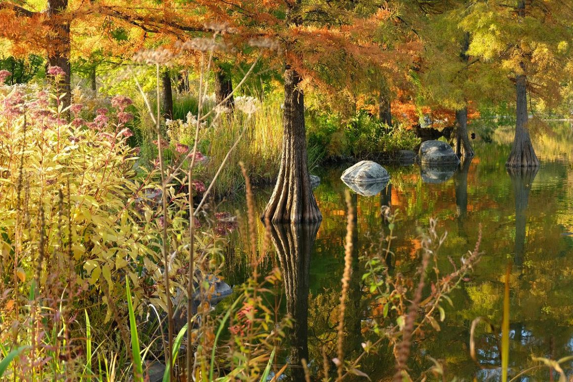 Die Sumpfzypresse – Taxodium distichum – beeindruckt den Betrachter gleichermaßen mit ihrem senkrecht gefurchten, unteren Stamm im seichten Wasser und ihren nadelartigen Blättern in rostroter Herbstfärbung.