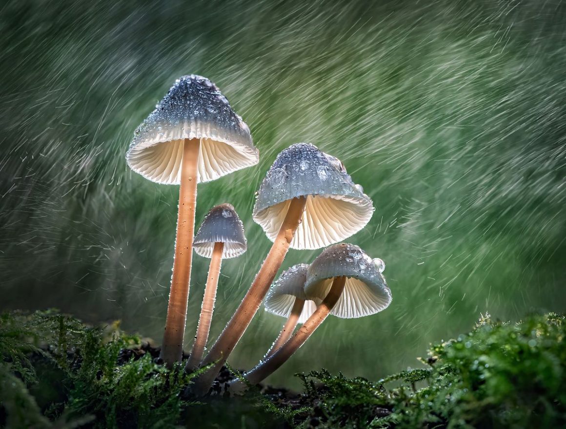 Die Gruppe von Mycena-Pilzen setzte Tony North besonders in Szene: Mit einer Wasserspritze erzeugte er den wirbelnden Regeneffekt, die Wassertropfen auf den Pilzen beleuchtete er mit einem Lightpad.