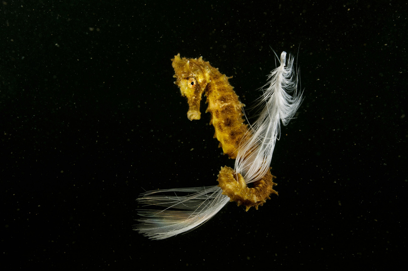 Gewinner in der Kategorie „Unterwasserleben“ ist das Bild des spanischen Fotografen Francisco Javier Murcia Requena. Es zeigt ein junges Seepferdchen, das eine Möwenfeder im spanischen Mar Menor „umarmt“. Die Aufnahme ist eine Hommage an die jungen Seepferdchen, die in der ersten Lebensphase lernen, sich fortzubewegen, indem sie ihren Schwanz um jedes schwimmende Objekt wickeln.