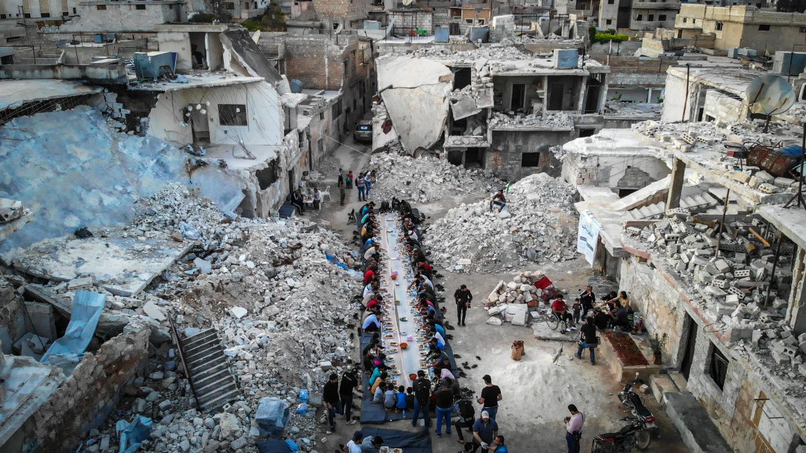 Der syrische Fotojournalist Mouneb Taim erhielt den ersten Preis in der Kategorie As Shot für seine Drohnenaufnahme eines Massenfrühstücks zum Ramadan in den Ruinen einer bombenzerstörten syrischen Stadt.