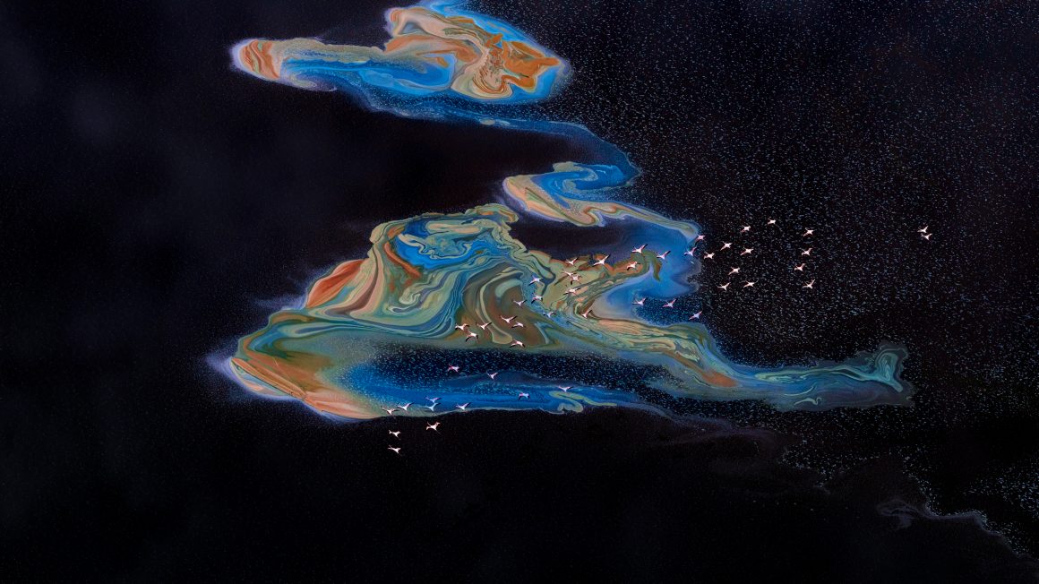 Die US-Fotografin Jie Fischer siegte in der Kategorie „Landschaft und Abenteuer“ mit einem farbenfrohen, fast abstrakten Portfolio, das Flamingos über dem farbenprächtigen Wasser des Magadi-Sees in Kenia zeigt.