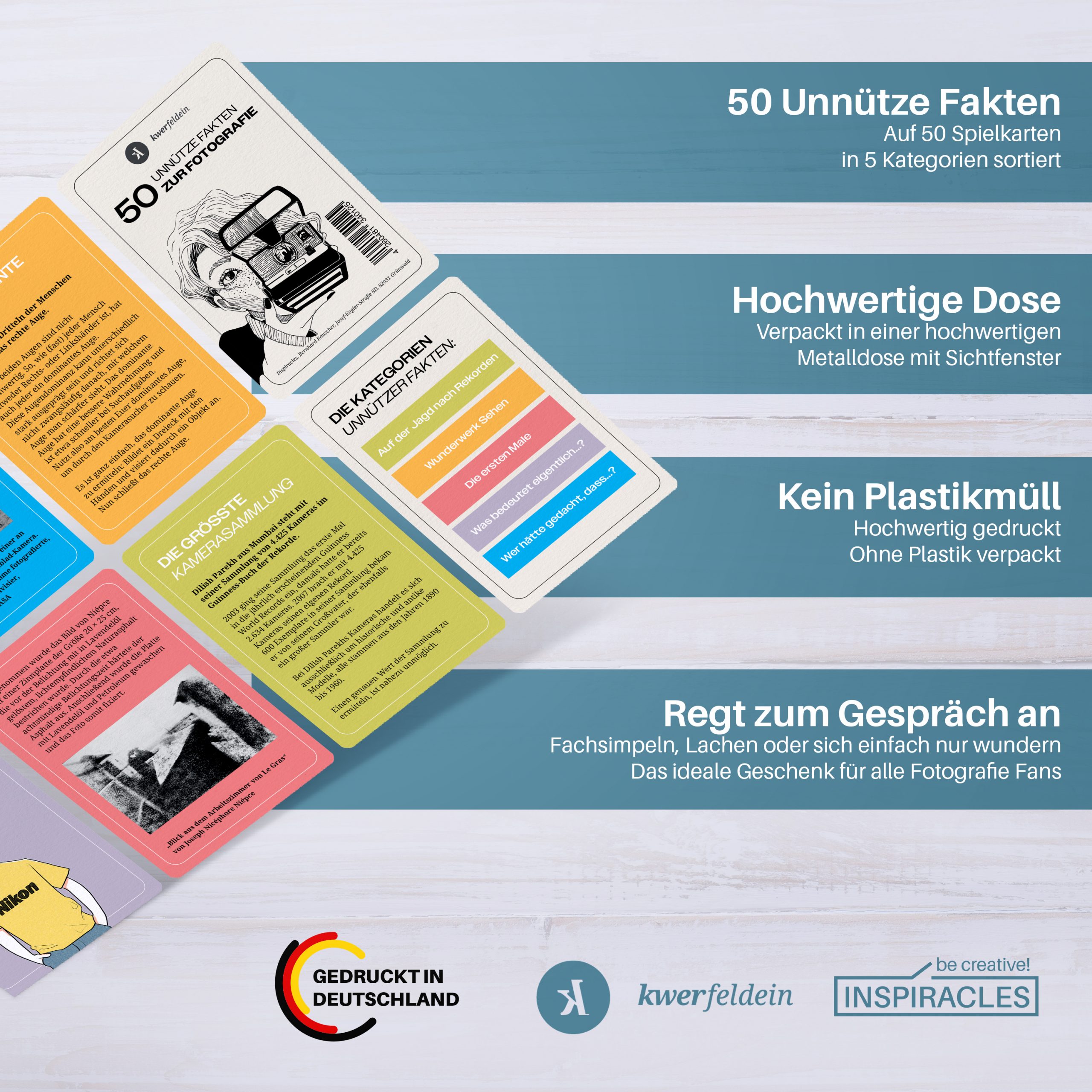 Das Kartenset wurde liebevoll gestaltet und illustriert, es erscheint im Verlag Inspiracles und ist in einer kleinen Metalldose verpackt. Damit ist es das perfekte Geschenk für Fotograf:innen und bietet einiges an Unterhaltung auf der nächsten Vernissage oder im Fotoclub.