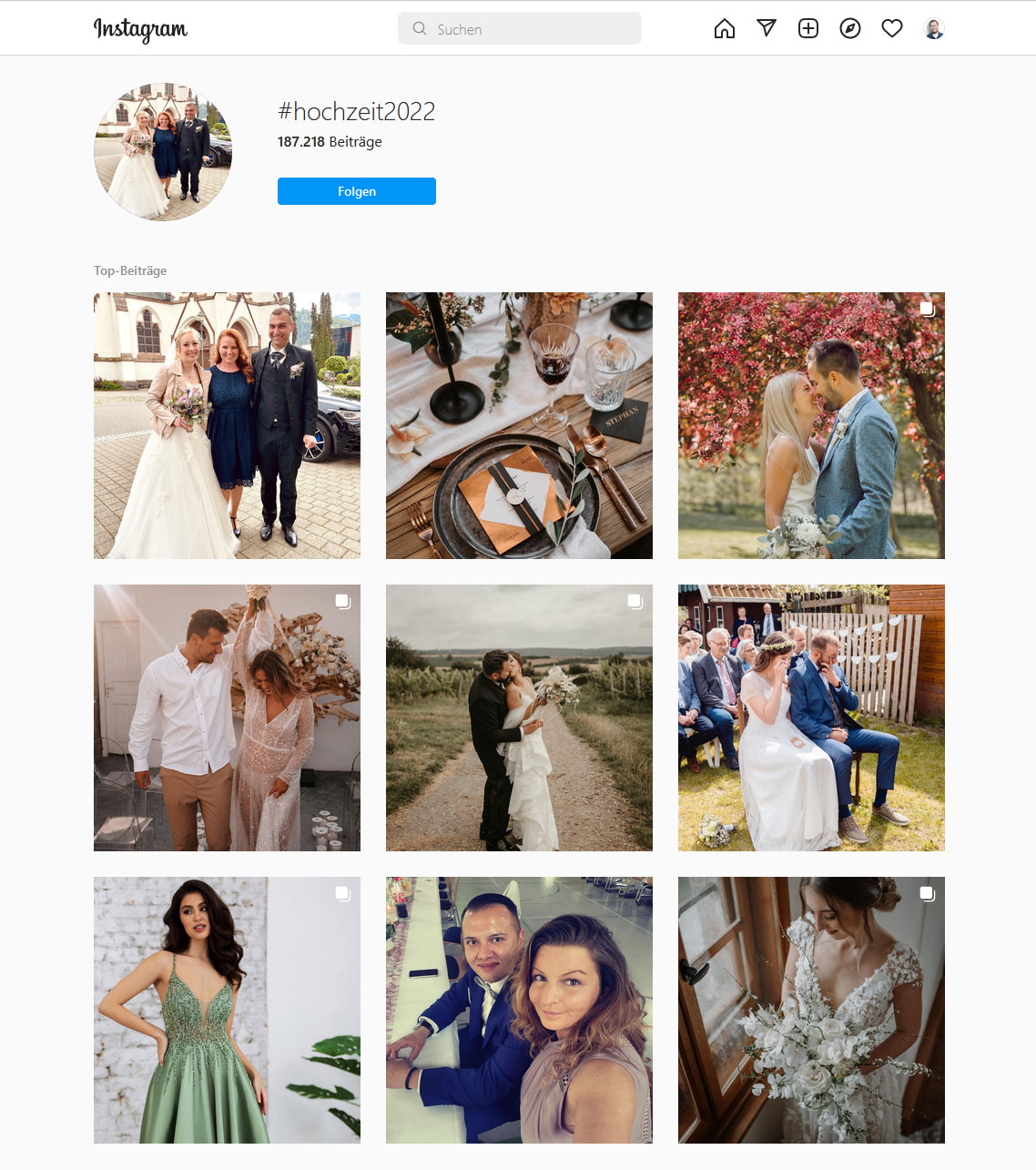 Wer nach Bildern mit dem Hashtag #hochzeit2015 sucht, für den spuckt Instagram etwa 13.000 Treffer aus. Ein Jahr später hat man schon fast 50.000 Treffer und #hochzeit2017 reißt schon fast die 100.000er-Marke. Der Hashtag #hochzeit2021 kommt mittlerweile auf 299.000 Beiträge. Auf den Bildern sieht man in der Regel schöne Menschen in prachtvoller Kleidung, traumhaft-exotische Locations, ganze Ozeane aus Blumen und Blüten – fotografisch perfekt inszeniert nicht mehr vom Hobbyfotografen Onkel Willi, sondern von Vollprofis.
