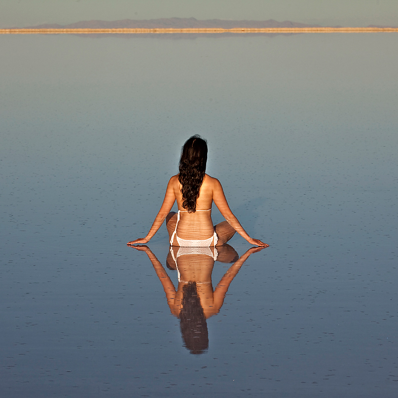 Ich selbst bin aber fasziniert von diesem nur wenige Zentimeter tiefen See und seinen perfekten Reflexionen an diesem windstillen Tag. Aufgeben gibt’s bei meinen Workshops nicht, und immerhin lassen sich meine Teilnehmer:innen überreden, trotz der ersten Enttäuschung aus dem Mietwagen zu steigen. Wir durchwaten den See, fotografieren die minimalistischen Spiegelungen und die Muster, die subtil durch das Wasser schimmern. Eine Bikinischönheit ist zufällig anwesend und lässt sich wie auf dem Wasser schwebend von uns ablichten (Bild 2). Am Ende entstehen neuartige, sehr gute Motive. Motive, die wir vermutlich so nie wieder fotografieren können.