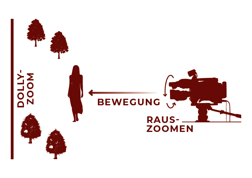 Der Dolly-Zoom ist eher ein Spezialeffekt und eignet sich hervorragend, um Charaktergefühle zu vermitteln. Die Kamera wird auf das Motiv zu- oder von ihm wegbewegt, während die Brennweite des Objektivs geändert wird. Dadurch wird die Größe des Motivs im Bild beibehalten, die Größe der Hintergrundelemente ändert sich. Es entsteht die Illusion, dass sich die Zuschauer:innen der Motivposition nähern oder weiter davon entfernen. Eine Technik, die beispielsweise im Film Vertigo verwendet wird.