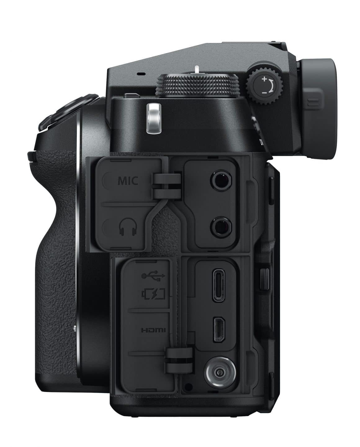 Links neben dem großen elektronischen Sucher mit einer Diagonalen von 0,5 Zoll, einer Auflösung von scharfen 3,7 Millionen Bildpunkten und kleinbildäquivalentem Vergrößerungsfaktor 0,77 findet sich ein klassisches Modus-Wahlrad sowie der Umschalter für den Video-Modus. Im Vergleich zu den Bedienkonzepten anderer Hersteller verdient die GFX 50S II für uns hier mehr denn je das Prädikat „aufgeräumt“.